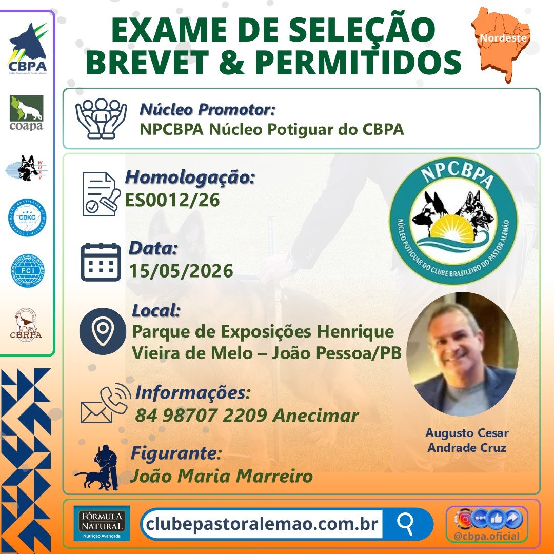 2026-05-15 Exame de Seleção e BREVET NPCBPA | 15/05/2026 - 15/05/2026 | PQ Exposições Henrique Vieira de Melo - João Pessoa, PB | NPCBPA - Núcleo Potiguar do Clube Brasileiro do Pastor Alemão | Augusto César Andrade Cruz Júnior | João Maria Marreiro da Silva | ES0012/26 | Inscrições |