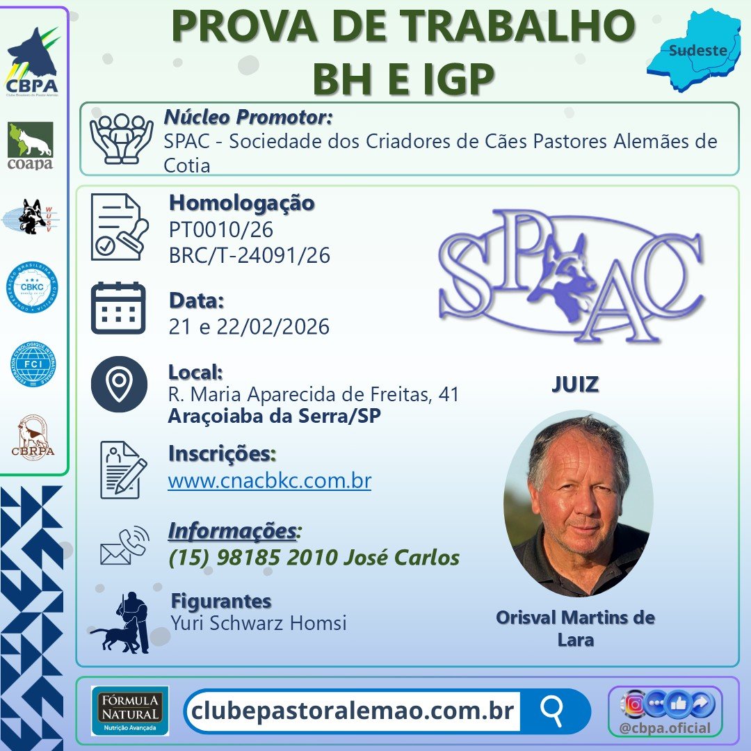 Catálogo Indisponível | Prova de Trabalho - BH e IGP - SPAC | 17/01/2026 - 18/01/2026 | CT Caio Alexandre Rodrigues - Araçoiaba da Serra, SP | SPAC - Sociedade dos Criadores de Cães Pastores Alemães de Cotia | Fernando Marcos Bigeschi | PT0003/26 BRC/T-24018/26 | |