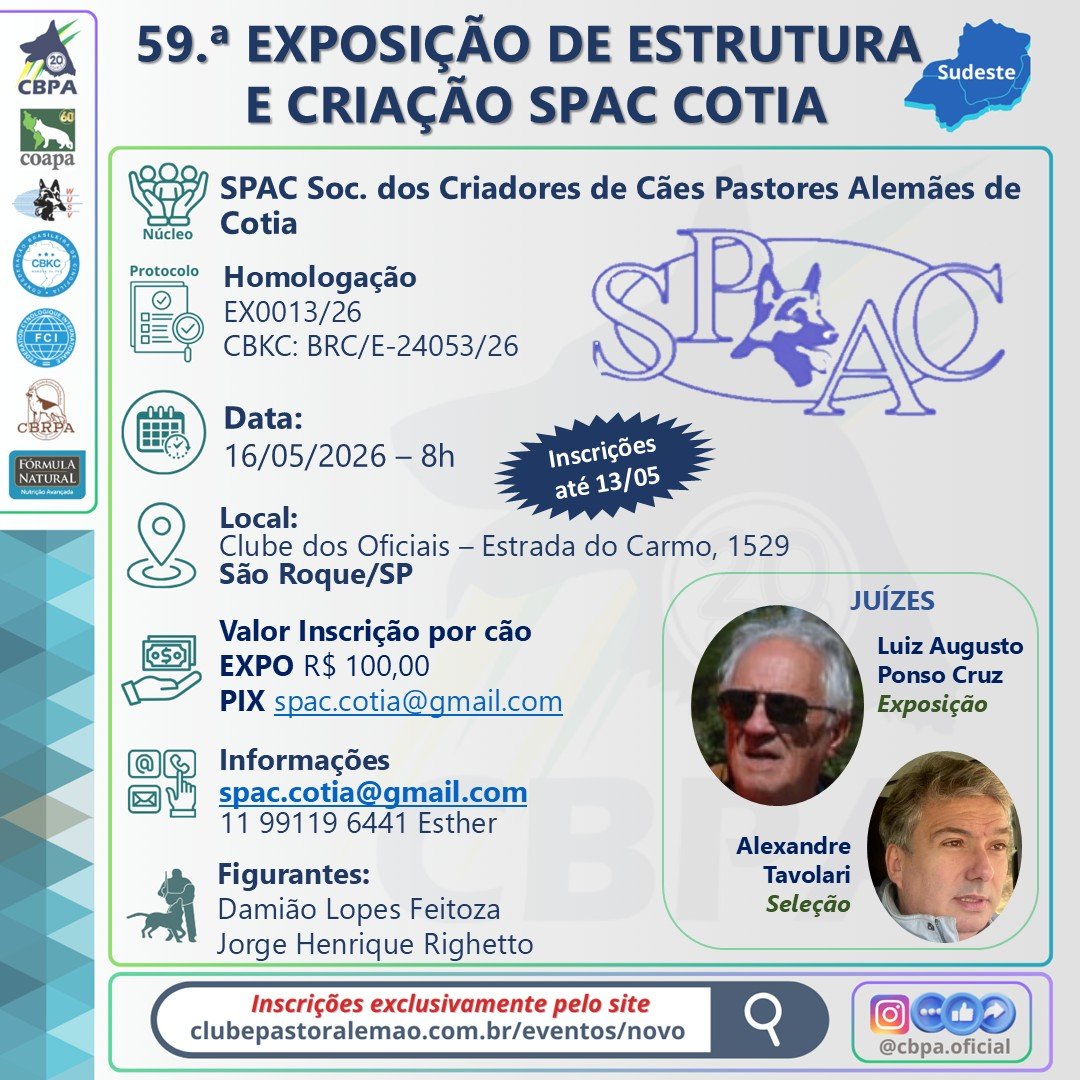 2026-05-16 59 Exposição Estrutura e Criação SPAC | 16/05/2026 - 16/05/2026 | Clube dos Oficiais - São Roque, SP | SPAC - Sociedade dos Criadores de Cães Pastores Alemães de Cotia | Luiz Augusto Ponso Cruz e Alexandre Campos Tavolari | Damião Lopes Feitoza | EX0013/26 CBKC: BRC/E-24053/25 | Inscrever |