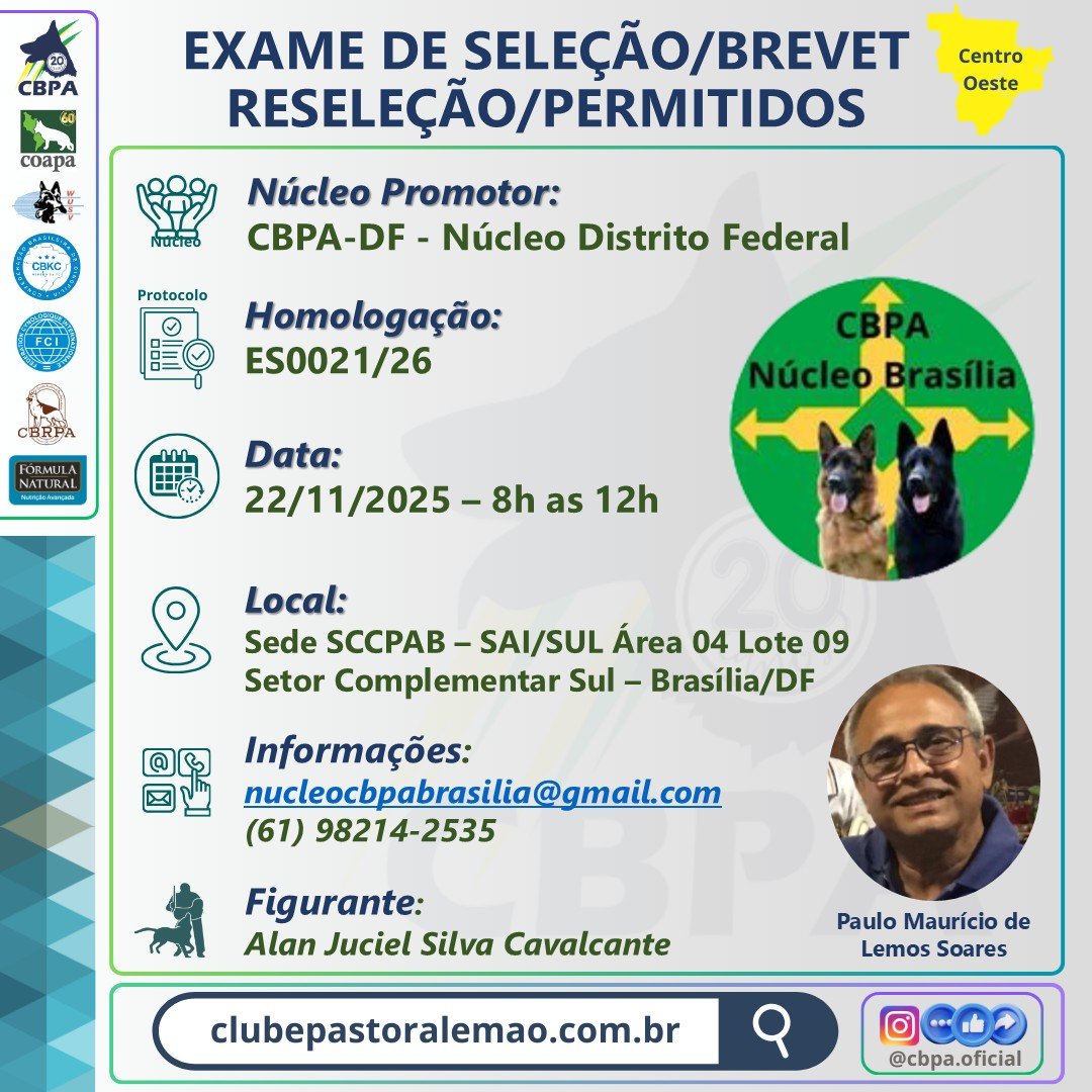 2026-02-2028 Exame de Seleção/BREVET/Reseleção/Permitido | 28/02/2026 - 28/02/2026 | Sede SCCPAB Brasília - Brasília, DF | CBPA-DF - Núcleo Distrito Federal | Paulo Maurício de Lemos Soares | Alan Juciel Silva Cavalcante | ES0021/26 | Inscrições |