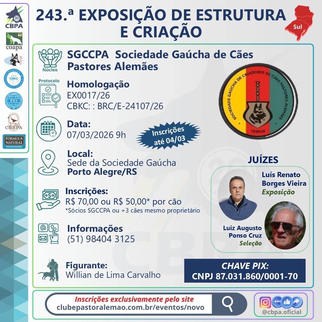 2026-03-07 243 Expo Estrutura e Criação SGCCPA | 07/03/2026 - 07/03/2026 | Sede da Sociedade Gaúcha - Porto Alegre, RS | SGCCPA-Sociedade Gaúcha de Cães Pastores Alemães | Luís Renato Borges Vieira e Luiz Augusto Ponso Cruz | William de Lima Carvalho | EX0017/26 CBKC: BRC/E-24107/26 | Inscrever |